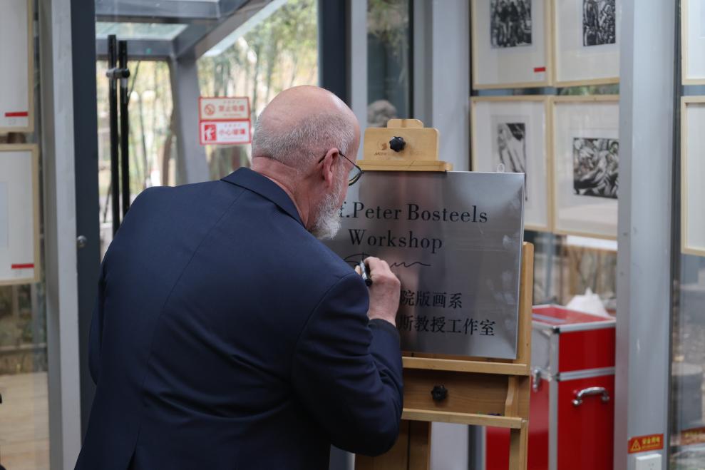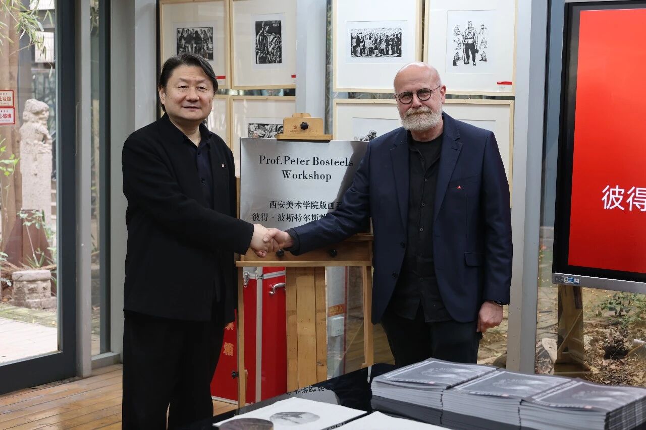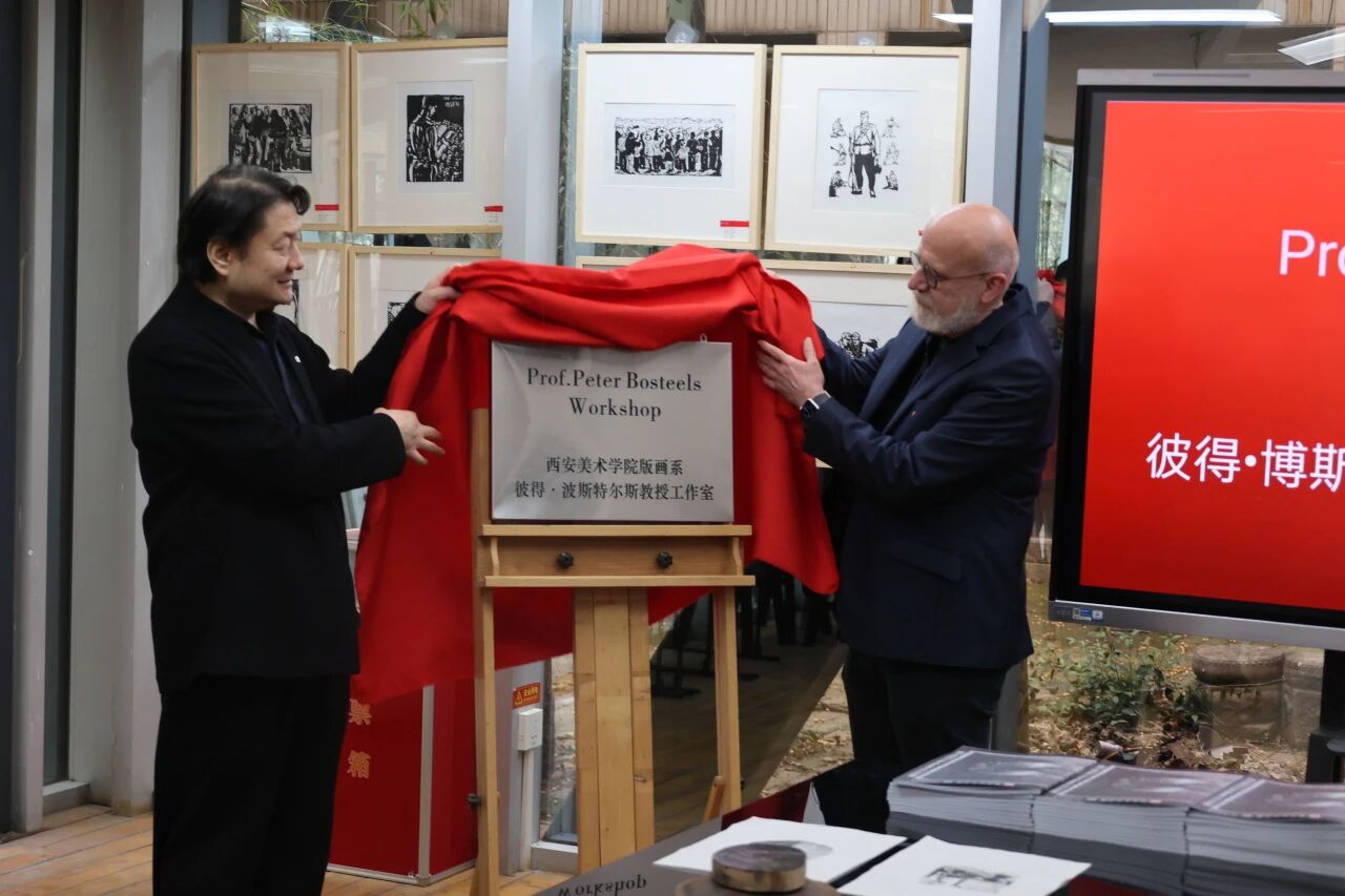 2026年4月2日,彼得·博斯蒂尔教授工作室授牌仪式在西安美术学院版画系国家级实验室顺利举行。本次活动是学校深化国际交流合作、推进版画学科国际化建设的重要举措,标志着我校中外版画学术交流与协同育人工作迈入新阶段。西安美术学院院长朱尽晖、比利时安德卫普皇家艺术学院版画系主任彼得·博斯蒂尔、西安美术学院版画系主任许欲晓、西安美术学院国际交流处处长陈天琪、版画系副主任刘益春以及版画系师生代表参加授牌仪式。